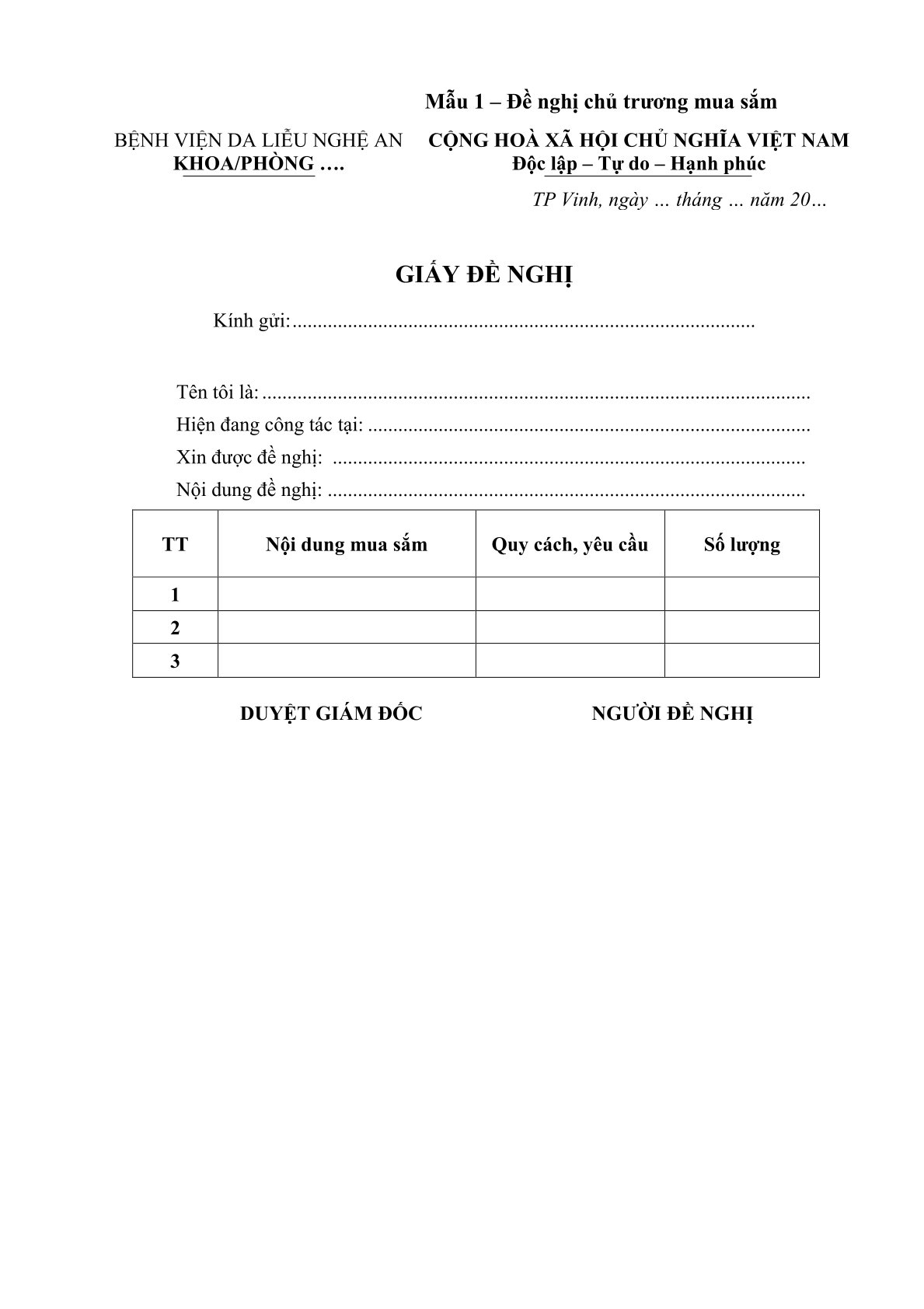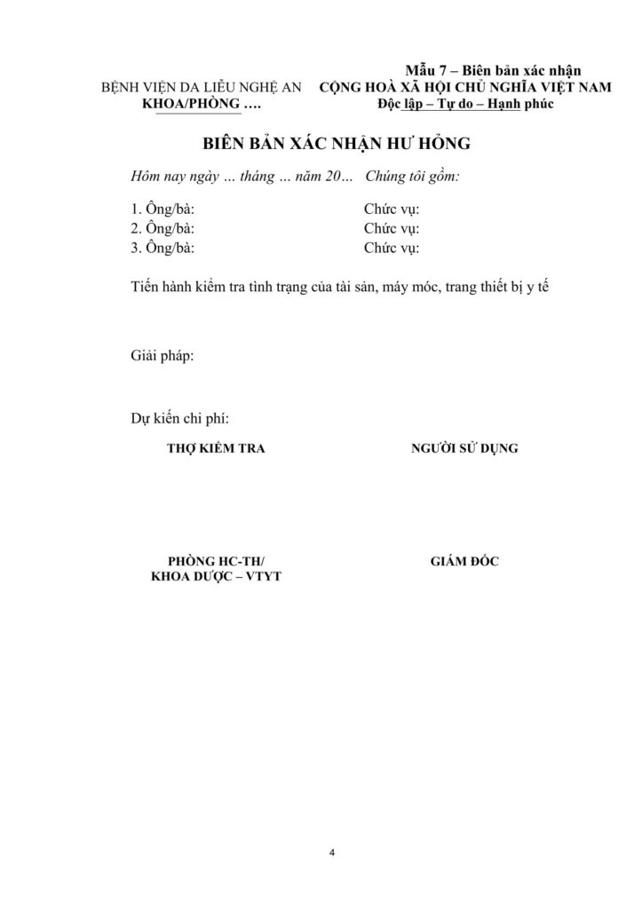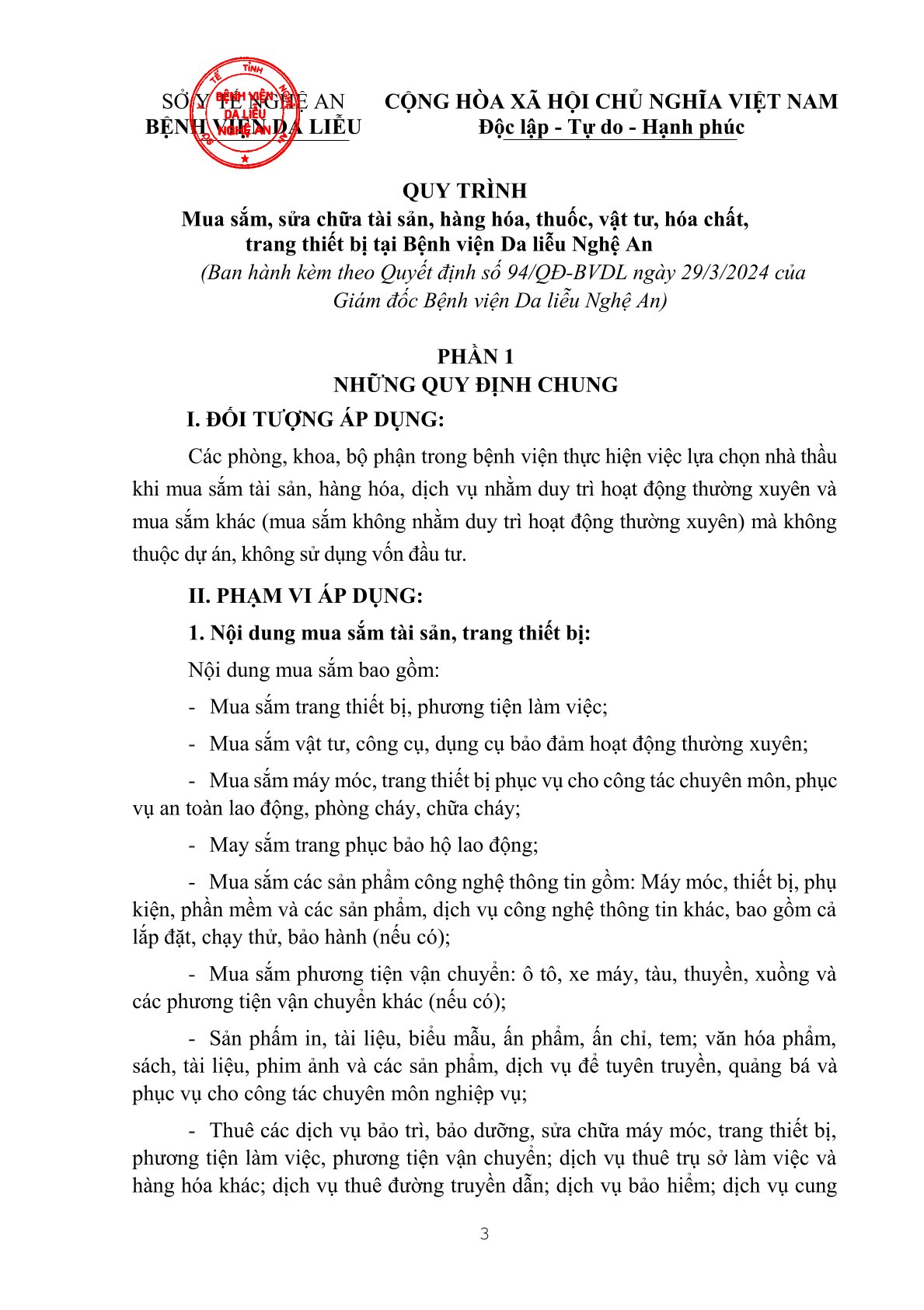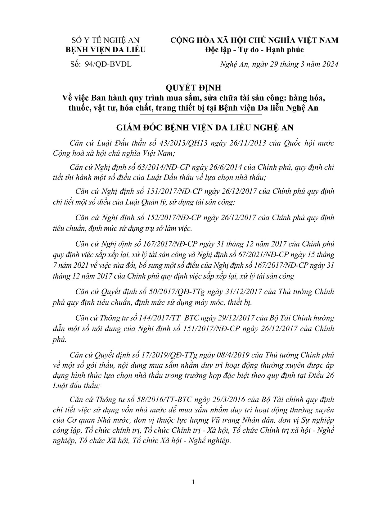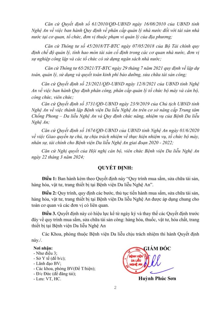 QUYẾT ĐỊNH Về việc Ban hành quy trình mua sắm, sửa chữa tài sản công: hàng hóa, thuốc, vật tư, hóa chất, trang thiết bị tại Bệnh viện Da liễu Nghệ An